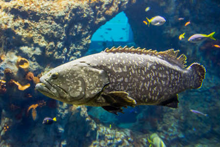 Large fish Giant grouper swimming in aquarium. Epinephelus lanceolatus, common brindlebass, brown spotted cod, or bumblebee grouper