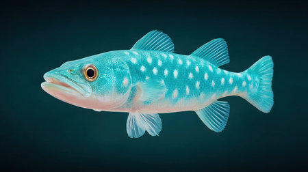 A fish with white dots on its body is swimming in the water. The fish is surrounded by a blue background