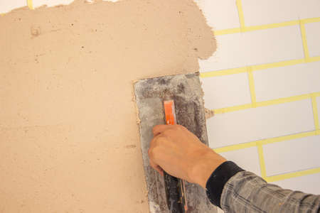 Home repair: installing the mosaic tile on the wall. A worker covers the wall with adhesive using a notched trowel.