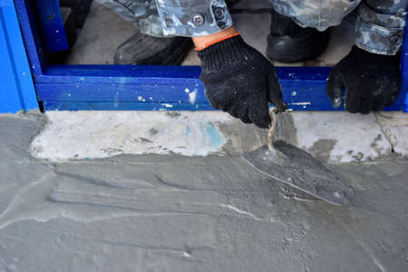 The master applies the solution to the spatula. A worker presses a spatula of adhesive mortar against the cement surface