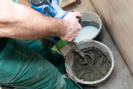 A construction worker mixes a special tile adhesive. Dense cement-based adhesive mixer.