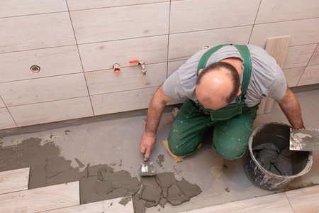 Professional construction worker laying ceramic tiles on the floor in the bathroom room.