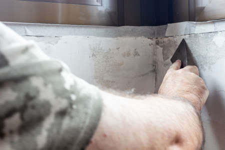 Unrecognizable worker with white plaster, dirty hand with spatula. Construction renovation background with free space for text.
