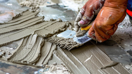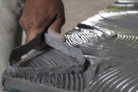 A detailed view of a worker using a trowel to apply mortar on floor tiles, showcasing the skill and precision required in construction and home renovation tasks.