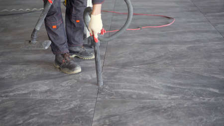 Worker cleans seams between tiles using a vacuum cleaner. Tile master, vacuums the floor to prepare for trowelling. A worker vacuums the ceramic tile floor.