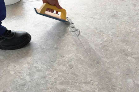Fix joints on ceramic floor tiles. The concept of single-family housing as well as interior and exterior finishing (e.g. laying ceramic tiles). Image perfect as a website banner.