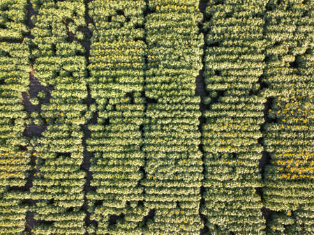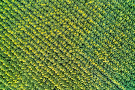 Natural agricultural sunflowers field , aerial view from drone at summer time. Top view.