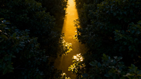 Sunlight Filtering Through the Lush Green Canopy of a Dense Forest Rays of light pierce through the verdant foliage creating a captivating and serene natural scene