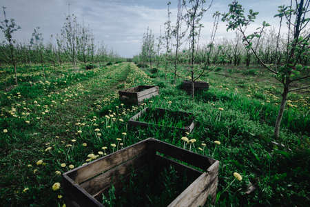 Old wooden boxes in scenery of young apple trees