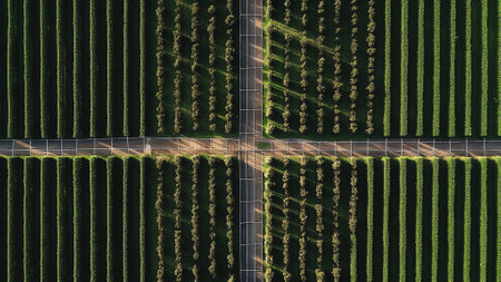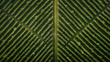 top view of a perfectly aligned farm fruit trees plantation, green field background agricultural industry aerial view
