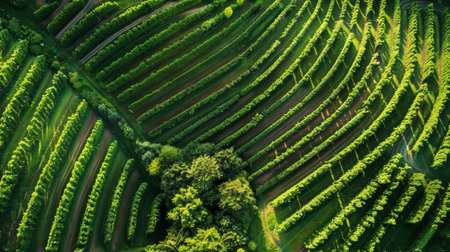 This captivating aerial photograph showcases lush green rows of a vineyard, illustrating the beauty of agriculture in a serene rural landscape. The vibrant hues and well-structured rows indicate a healthy crop.