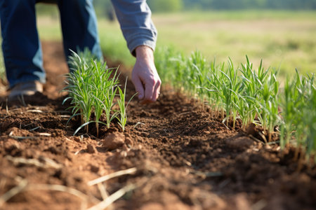 A farmer tending to a lush green field, rural landscape, close-up of hands in soil, symbolizing agriculture and sustainability. Resplendent.