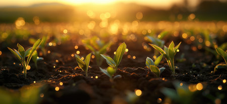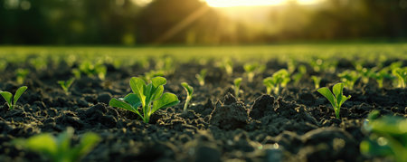 Closeup of young green seedlings sprouting in fertile soil, illuminated by warm sunlight, symbolizing growth and nature's renewal.