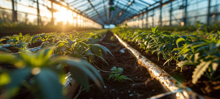 Spacious modern greenhouse with rows of emerging hemp seedlings. High-tech facility with advanced hydroponic systems. Legalized cannabis cultivation for medical purpose.