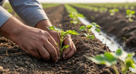 A farmer gently holds rich soil above a young green plant, symbolizing nurturing care and growth in an agricultural setting. The background features leafy greens, emphasizing vitality.