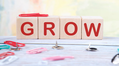The concept word GROW is collected of wooden cubes on an abstract background. Investment concept