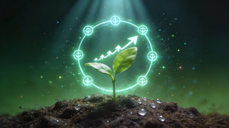 A young green plant with two leaves sprouts from dark soil. To its right, a bar graph shows a steady upward trend from 2018 to 2026, with the year 2026 highlighted at the peak. Golden sun rays stream in from the upper left, illuminating the scene and casting a warm glow.