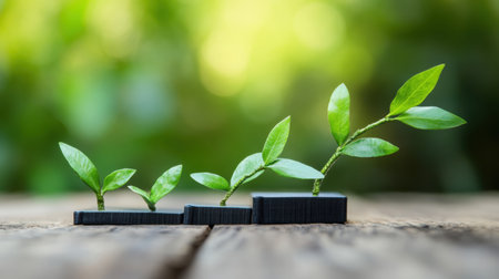 A creative metaphor for business growth, investment, and sustainability. Young plants ascend in a stepped bar graph, symbolizing increasing profit, development, and environmental progress against a moody, deep natural backdrop.