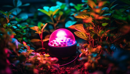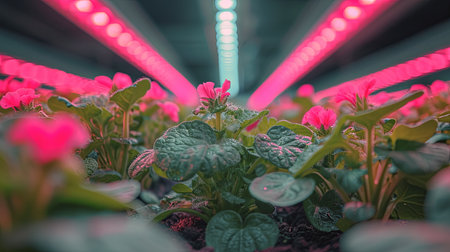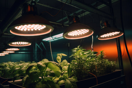 close-up of led grow lights illuminating plants, created with generative ai