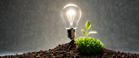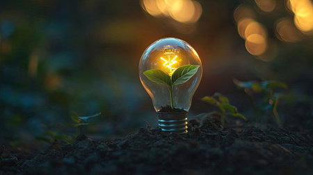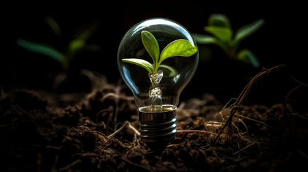 Light bulb surrounded by green leaves emerges from soil, symbolizing fusion of nature and technology. This evokes sense of innovation and environmental consciousness
