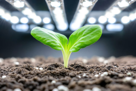 Plant emerging from soil, illuminated by natural light, symbolizing growth and technology in modern agriculture.