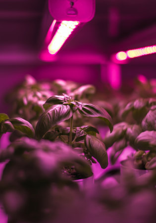 Indoor hydroponic basil growth under led purple lighting in controlled environment.