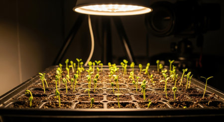 Organic seeds sprouting in biodegradable pots ready for transplanting, bright growing environment and copy space