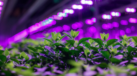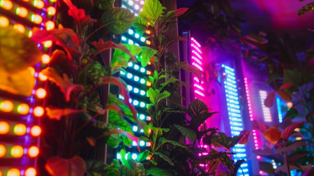 Experience a vibrant indoor vertical farming environment featuring advanced LED lighting, optimized for plant growth. This setup showcases innovative techniques for sustainable agriculture, enhancing crop production efficiency in urban settings.