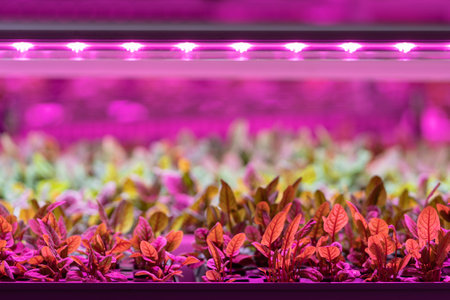 Pink led grow lights illuminating young seedlings in vertical farming setup, highlighting sustainable agriculture innovation