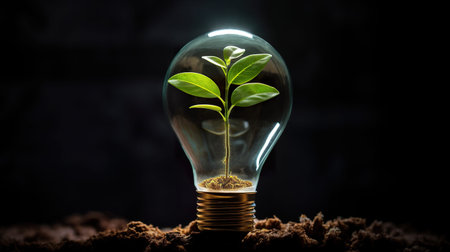Close-up of a plant growing in a lightbulb, symbolizing eco-friendly energy solutions. Copy space.