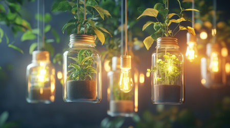 Beautifully arranged hanging glass jars with plants inside, glowing light bulbs hanging around them, surrounded by soft bokeh lighting, creating a serene and natural ambiance