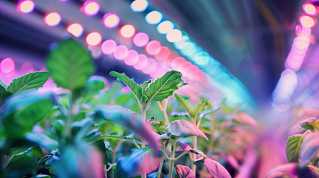 A close-up of colorful plants growing in a controlled environment under laboratory lights, representing advancements in agriculture