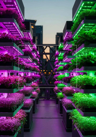 Urban vertical farms beneath neon lights, the glow of progress feeding the masses