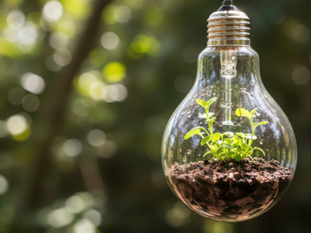 A light bulb filled with soil and a small plant sprouting from it, symbolizing the growth of ideas and sustainability.