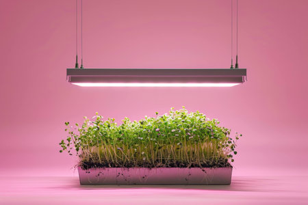 Modern indoor garden with sprouts growing under bright pink LED grow light, showcasing urban gardening concept and sustainable living.