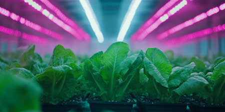 Vibrant Green Lettuce Flourishing Under Modern LED Grow Lights in an Indoor Vertical Farm