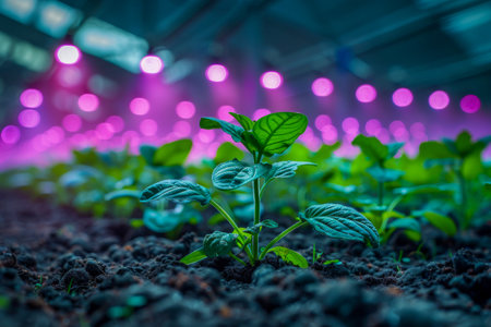 led grow lights illuminating rows of indoor plants, created with generative ai