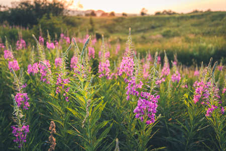 Rural sundown landscape with meadow fireweed flowers in foreground. Natural background with soft focus. Fireweed effective helping to normalize sleep and psycho-emotional state. local nature beauty.
