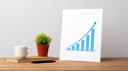 A modern growth chart illustrates business success on a wooden desk featuring a coffee mug, potted plant, and notebook, evoking a productive office atmosphere.
