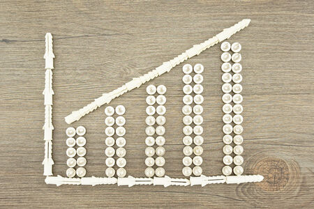 Screws and wall plugs placed as bar and line chart on dark brown wood background.