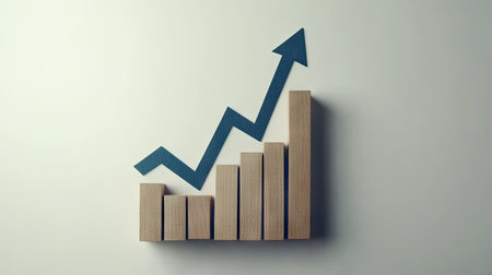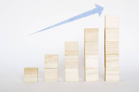 Graphic representation of a rising trend. Wooden blocks arranged in a bar graph format with an upward pointing arrow graphic superimposed. The image is simple and highlights upward movement.