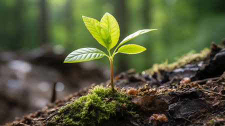 A young green sprout grows from rich soil in a natural forest setting, captured in sharp macro detail with vibrant lighting.