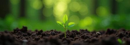 Small green plant sprouting from dark soil, symbolizing growth and renewal in natural environment. sunlight gently illuminates leaves, creating serene and hopeful atmosphere