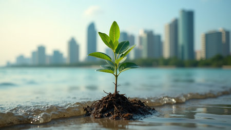Emerging mangrove sapling in urban coastal landscape symbolizing resilience and sustainability