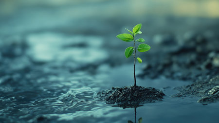 A young plant is growing vigorously out of a puddle of water, showing natures resilience in an urban environment. Eco-friendly and sustainable urban development concept.