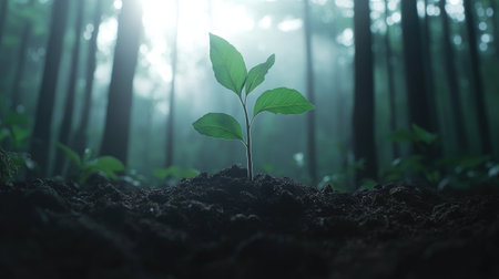 A new sapling emerging from the earth in a forest, with sunlight filtering through the trees, symbolizing hope and the future of our planet