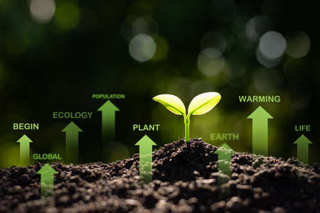 Young plant growing in the morning light and green nature bokeh background , new life growth ecology business financial progress concept ,Earth Day