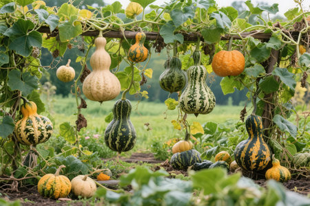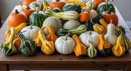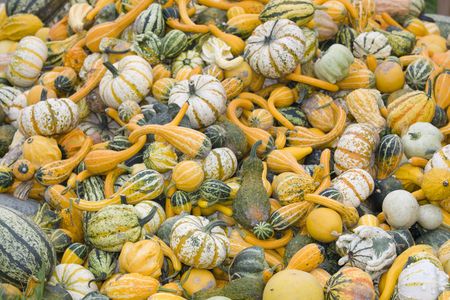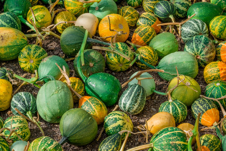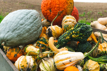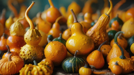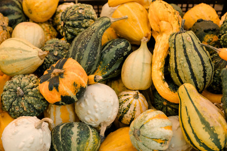 Fresh colorful gourds in various shapes and colors arranged in bulk, symbolizing autumn harvest, organic farming, seasonal vegetables and natural decoration for food and lifestyle visuals.