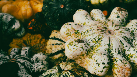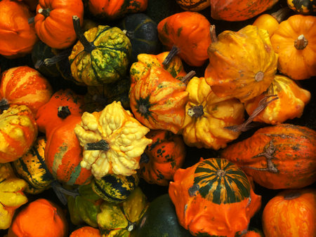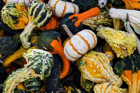 Autumn harvest colorful pumpkins and squashes in different varieties at farm market or seasonal festival. Background of decorative fall and winter squashes