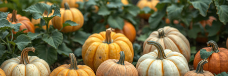 Pumpkin patch on sunny autumn day. Colorful pumpkins background.